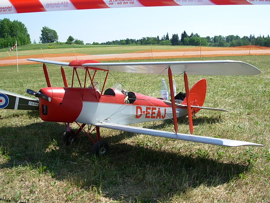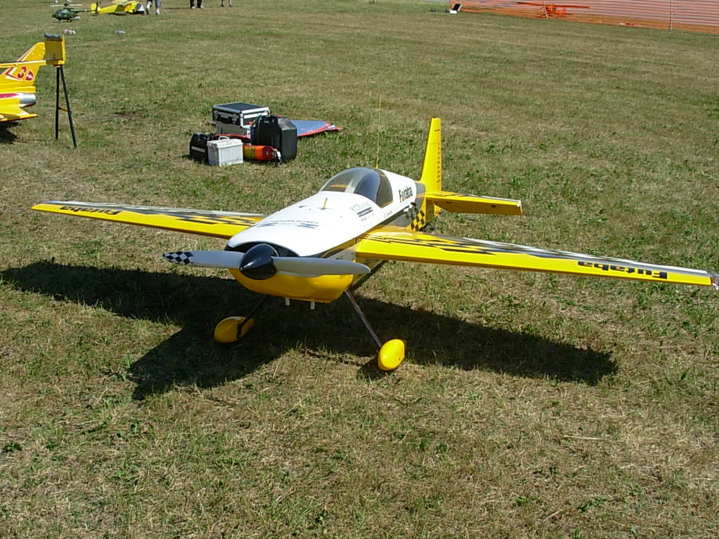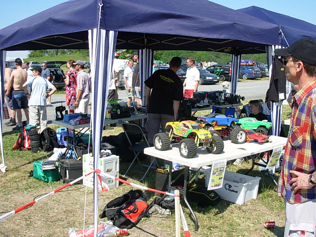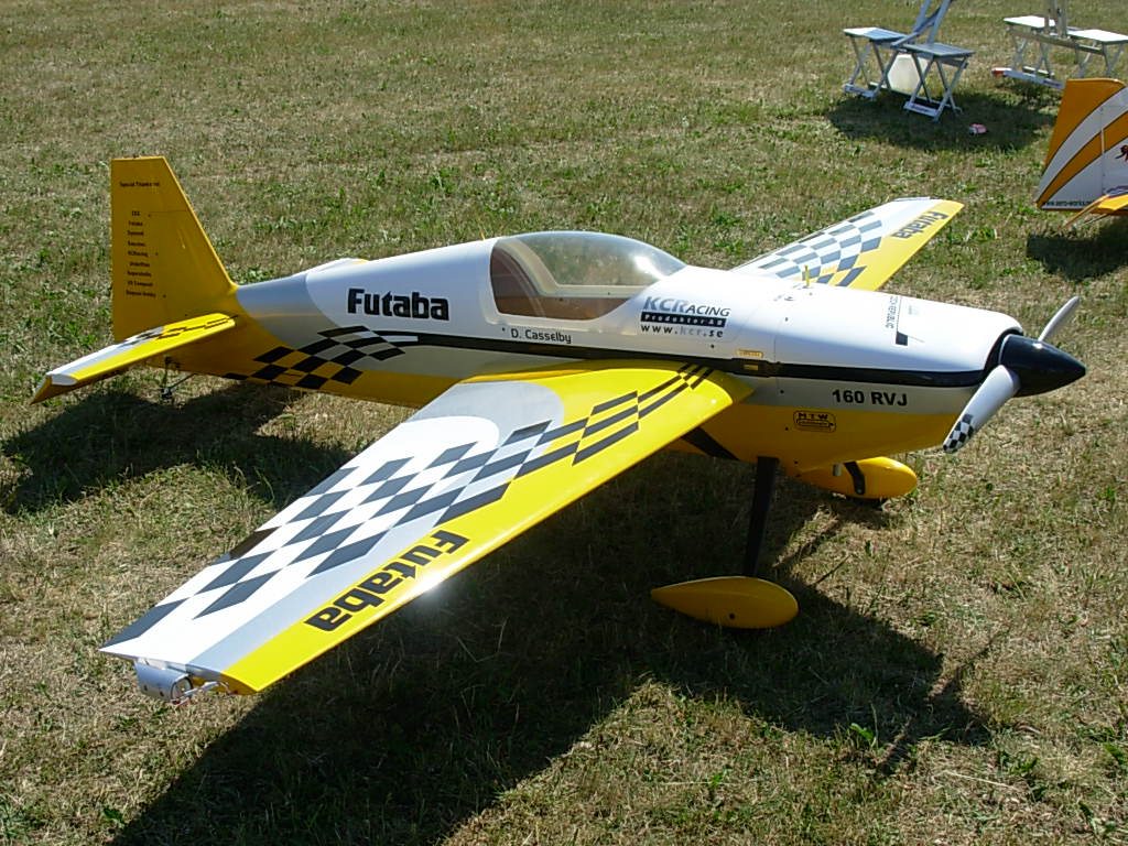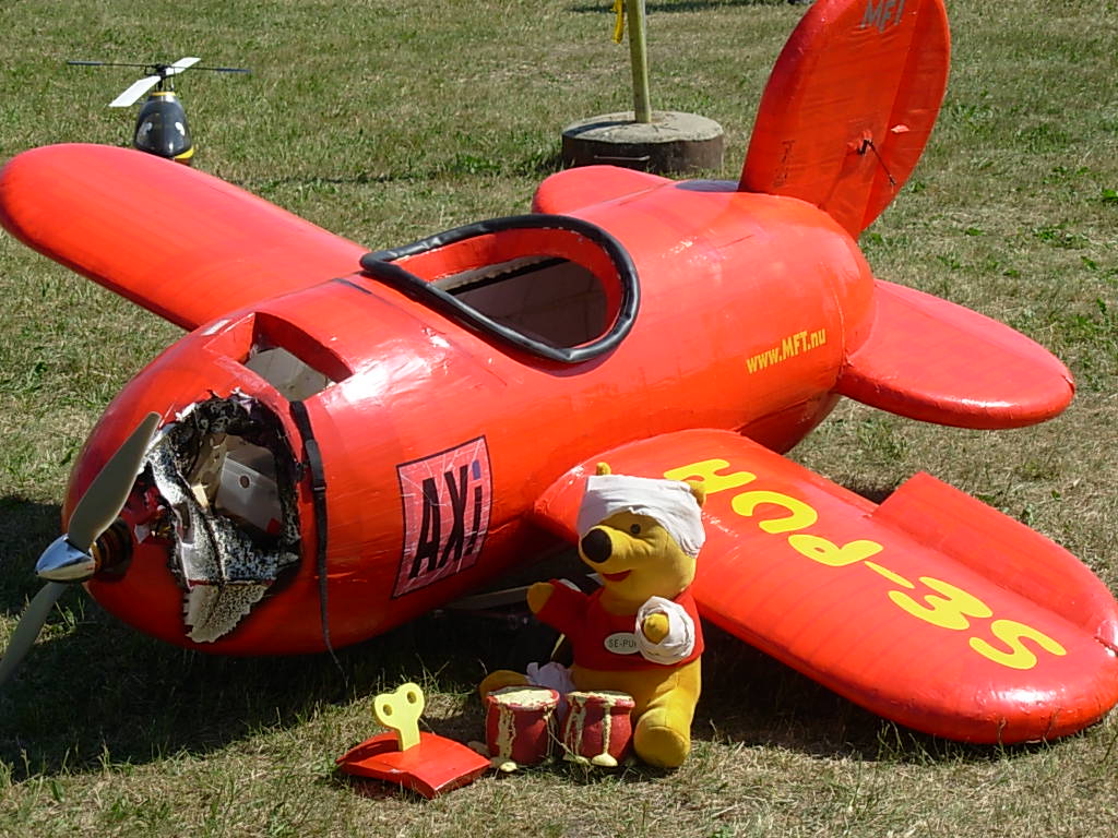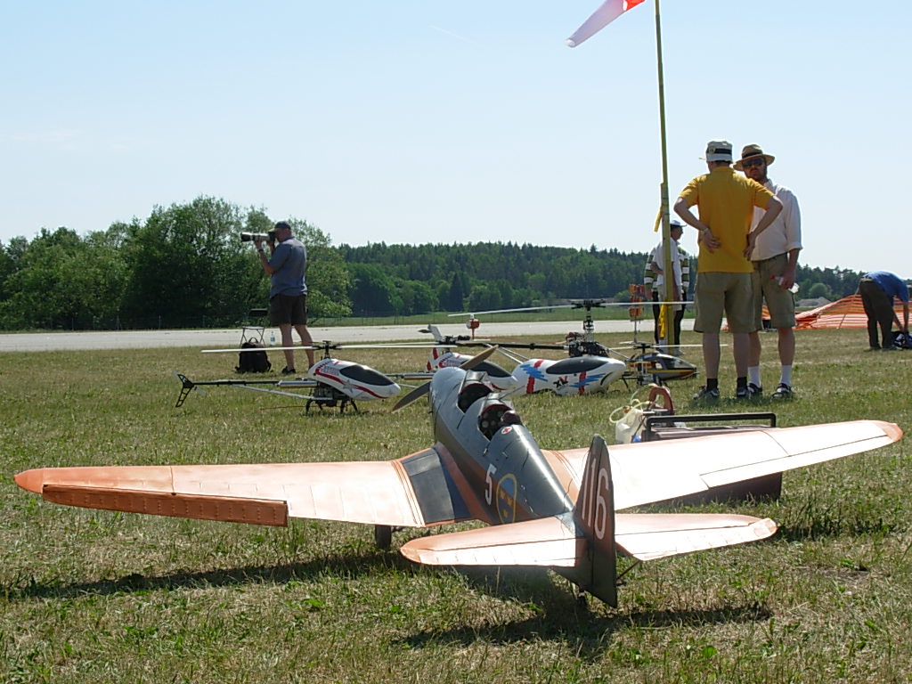 Tog pendeltåget till Barkarby station och sen buss som stannade strax utanför vandrarhemmet som låg inom synhåll från Barkarby flygfält. Toppen, tänkte jag... det blir bara en kort promenad i morgon. Mer om detta strax. Skrev in mig i gästboken strax under Per Strömmen från Norge. (Per flyger turbin-jet modeller och arbetar som pilot på SAS). Första kvällen gick åt till att bekanta mig lite med området och före läggdags kollade jag på uppskjutningen av Atlantis på NASA-TV på vandrarhemmets dator. Lördag morgon och dags att bege sig till fältet. Från vandrarhemmet såg jag ena änden av fältet men ingen aktivitet så det tydde på att allting hände i andra änden. Men inga skyltar nånstans och ett högt metallstaket med taggtråd omringade fältet. Några portar såg jag men de var alla låsta. Jag frågade några förbipasserande och fick lite olika vägbeskrivningar. Nåja, jag traskade vidare och efter nästan 2 timmars vandring i 32 graders värme hittade jag äntligen fram. Det visade sig sen att det finns en mycket kortare väg, c:a 20 min. Jag får tacka den äldre herren i hangaren för tipset och han lånade dessutom ut en liten ihopvikbar cykel till mig så jag kunde ta mig dit enklare nästa dag! Det var stor publik och en massa tält där olika hobbyfirmor sålde sina grejer. Det mesta inom modellhobbyn fanns att beskåda. Mest flygplan förstås, men även helikoptrar, bilar, båtar och så modellerna som skulle tävla i SpeX-flight klassen. Dessa är svåra att kategorisera eftersom det handlar om flygande gräsklippare, parkbänkar och hajar. |