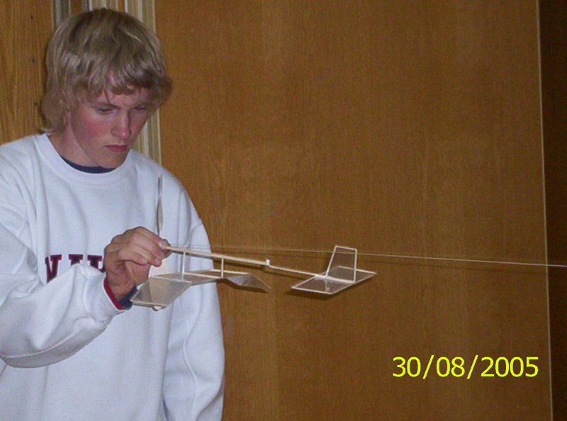 ![]() Teemu Alanko pitelee Kolibria kun kumiin vedetään kierroksia. Teemu Alanko håller i modellen så länge gummimotorn vevas upp. |