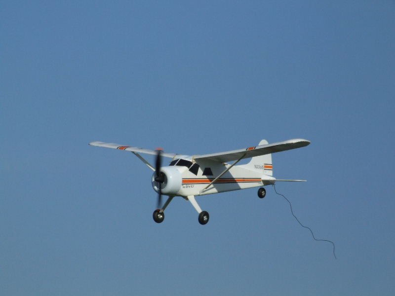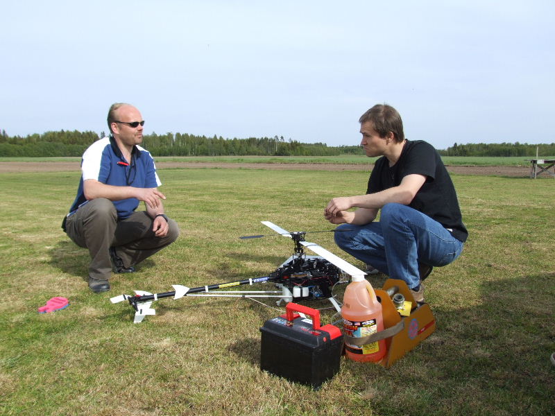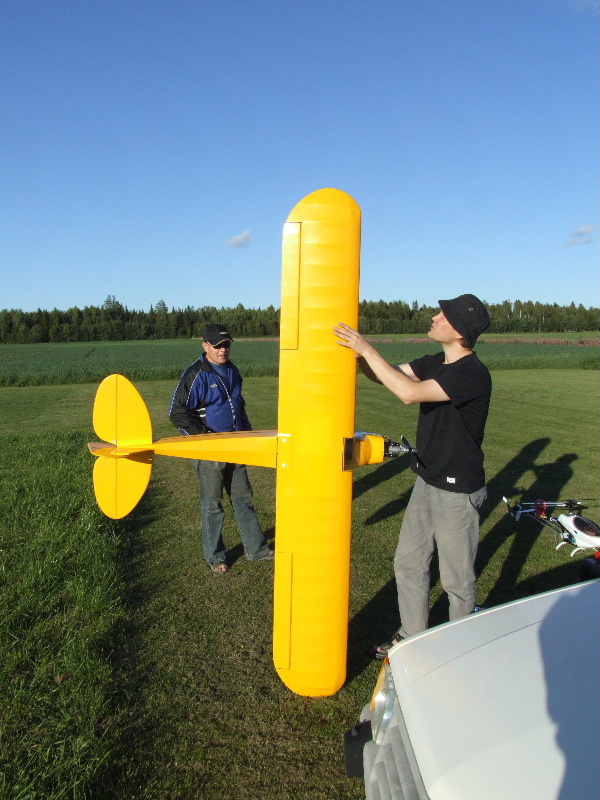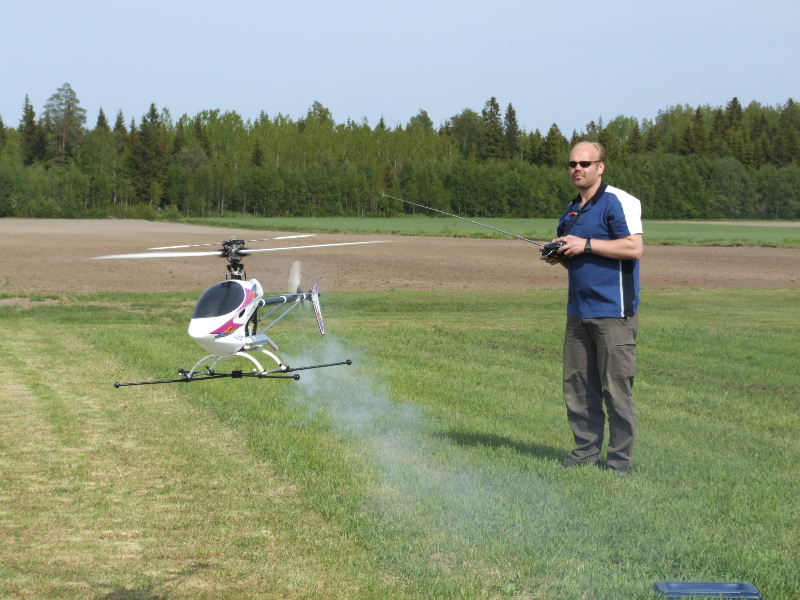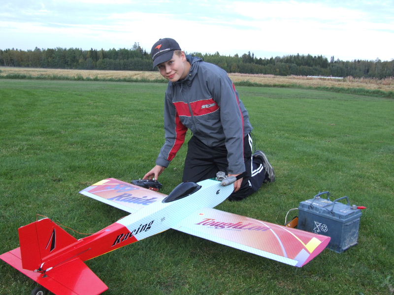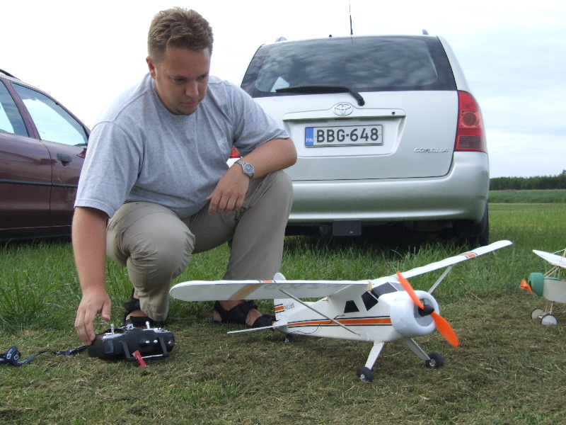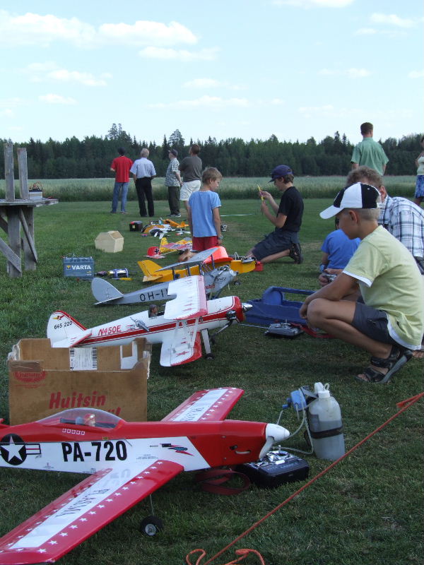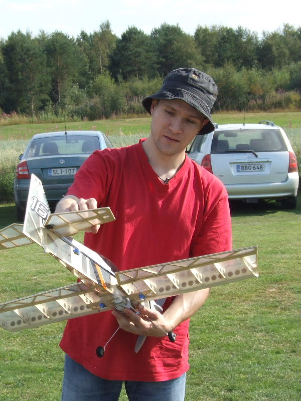 | Jos ei tuule liika, voi ulkona lennättää myös keveitä sähkölennokkeja. Jani Hautapakan GWS Beaver (ylh.), Ilkka Klemetin Garupner Junkers Ju 52 (ylh. oik.) ja Teemu Alangon GWS Slow Stick (oik.). | I fall det inte blåser allt för mycket, kan man också flyga ute med lätta elmodeller. Jani Hautapakka med sin GWS Beaver (ovan), Ilkka Klemettis Graupner Junkers Ju 52 (ovan t.h.) och Teemu Alankos GWS Slow Stick (höger). | ![]() |