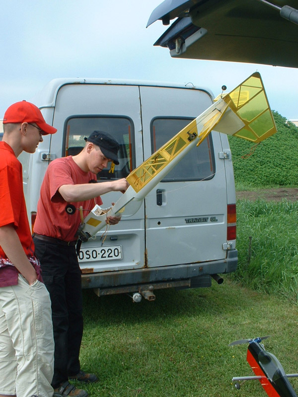![]() Juhani Lauri valmistelee Laser 3D -lennokkiversiotaan Juhani Lauri förbereder sin version av Laser 3D -modell. |