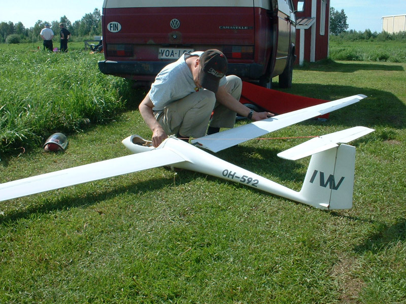 ![]() Kimmo Hantula laittaa 1/4-mittakaavan ASW-19B-lennokkia lentokuntoon. Kimmo Hantula gör sin 1/4-skala ASW-19B flygfärdig. |